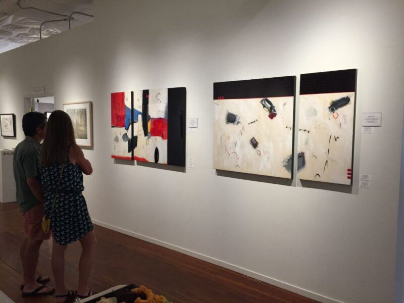At the Marin Museum of Contemporary Art’s Fall National Juried Exhibit – discussing a totem with a viewer. November 2016.